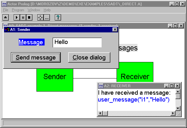 При нажатии левой кнопкой мыши на блок визуального интерфейса программы, соответствующий процесс получает сообщение show(Имя_блока). Следовательно, при нажатии на блок "Receiver" визуального интерфейса, процесс Receiver получит сообщение show и откроет окно con. Класс 'Sender' является потомком предопределённого класса 'Dialog', реализующего управление диалоговыми окнами. При нажатии на блок "Sender" визуального интерфейса, процесс Sender получит сообщение show, которое откроет диалоговое окно в соответствии с определением, заданным в файле _Direct1.DLG: