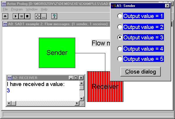 Обратите внимание, что при переходе процесса Receiver в состояние "неудачный", цвет соответствующего блока на экране автоматически изменился. Акторный Пролог автоматически изменяет цвет блоков при изменении состояния соответствующих процессов. Какие именно цвета следует использовать для изображения состояний "доказанный" и "неудачный", можно указать в файле определений диалоговых окон. Для этого используются команды success_color(MainColor,HatchColor) и failure_color(MainColor,HatchColor), где MainColor - цвет блоков, а HatchColor - цвет полосок (если задать его равным default, полосок не будет). Вот как определён цвет блоков в рассматриваемом примере (файл _Flow1.DLG):